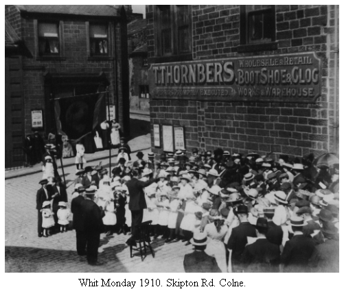Mr. Thornber's shoe and clog shop was a favourite place to visit, lower down Colne Lane on the same side as Dad's workshop. I first remember visiting Thornber's with mother to buy some Sunday best shoes - or perhaps they were boots - I can't remember. They were to be worn for the first time on Whit Sunday. I do however remember crying out when the button-hook nipped me on the ankle. Mr. Thornber, a kindly round - faced man, patted my cheek and said "Sorry, lassie".