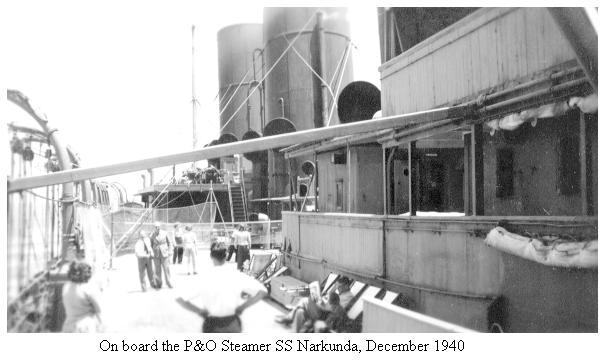 New Year's Eve was a greater success than Christmas had been, probably because we were near journey's end. 1940 had not been a good year anyway. The first two hours of my 1941 were spent in the cabin of one of the ship's engineers, drinking toasts and scoffing nuts, cake and chocolates. During the voyage I had come to appreciate the calibre of the officers, and it was a privilege to share their time off between watches. For me they represented the real world at sea, compared with that of the pampered passengers. There was a special significance to the New Year toasts that night; we learned that this was to be the last run of SS Narkunda as a passenger liner, and that she would become a troopship on her next run from home. Many of the engineers would leave her at Singapore and join the Ile de France, which had put in there when France had capitulated. The French ship had been taken over by the Allies.